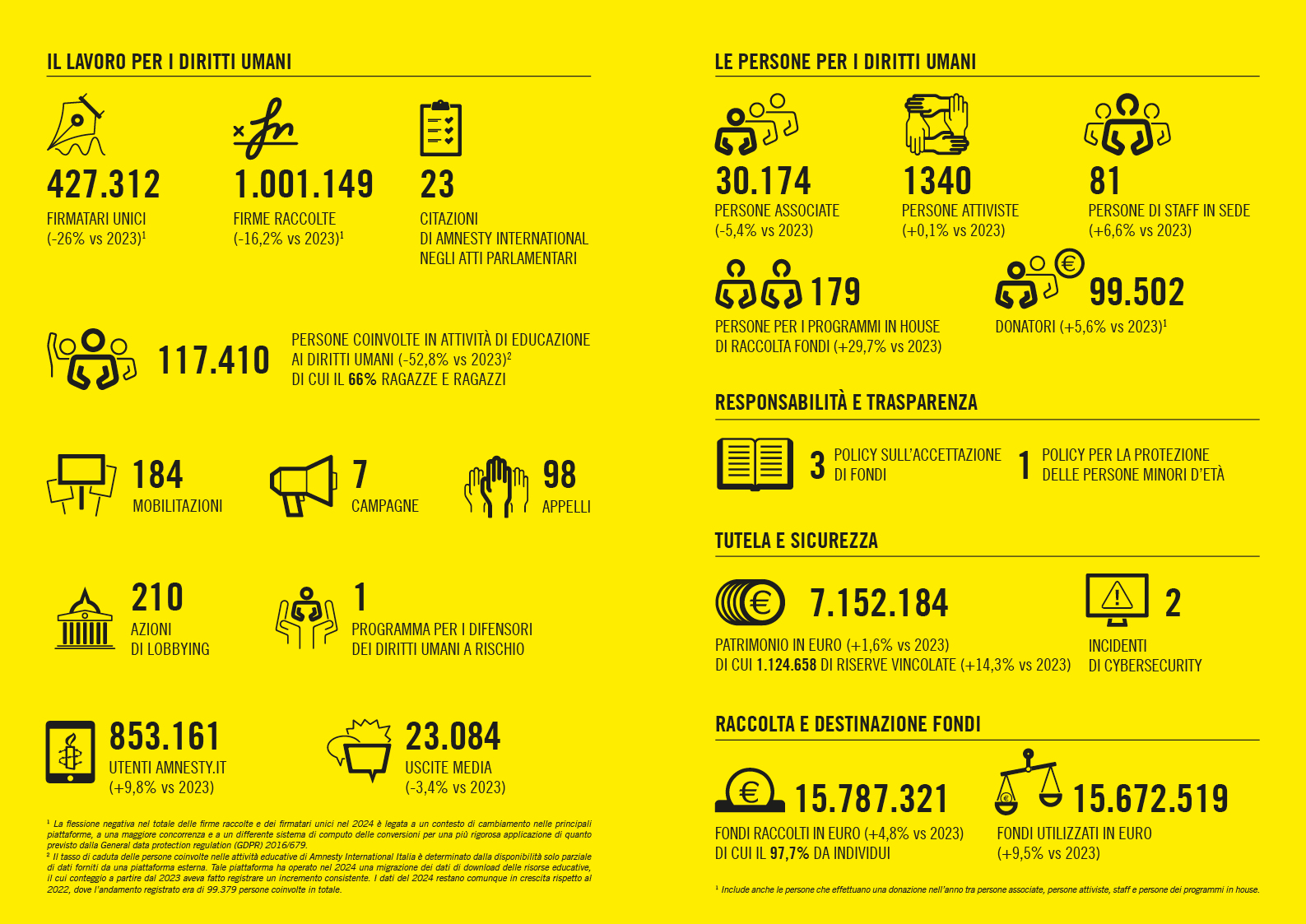 Il lavoro per la promozione e difesa dei diritti umani, le attività svolte e i principali risultati sono integrati da elementi d’indirizzo strategico e valoriale, dati di contesto, testimonianze e informazioni sulla struttura organizzativa e il sistema di governo, nazionale e globale, sui meccanismi di funzionamento della democraticità interna e del sistema di gestione dell’operatività. Sono inoltre presenti informazioni sulle persone che lavorano per l’organizzazione e sulle persone volontarie, sui risultati economico-finanziari e le principali iniziative di comunicazione e di raccolta fondi e informazioni su pratiche e processi interni tesi alla responsabilità, trasparenza, tutela e conformità normativa.